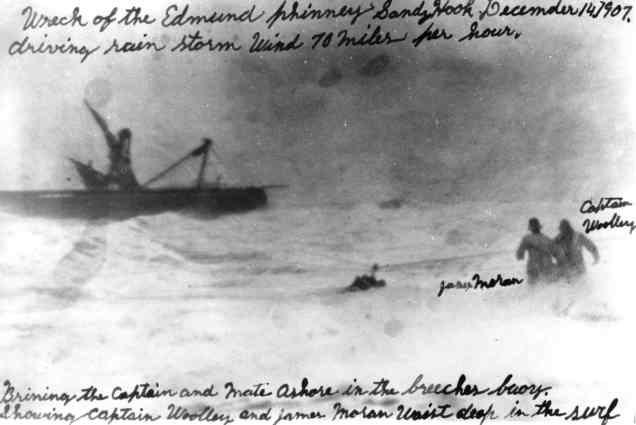 On December 17, 1907, the sailing ship Edmund J. Phinney wrecked during a fierce gale 300 yards off the Hook's North Beach area. Keeper Woolley's crew pulled their beach apparatus cart two and one-half miles against raging winds and over flooded beaches to meet Keeper Patterson's staff to save the crew of ten. Through freezing wind-swept waves, five seamen were laboriously hauled ashore by breeches buoy. With the ship on the verge of breaking up and no time to spare, the captain and first mate crammed themselves into the breeches buoy. They were just reaching the churning shore when the Phinney broke apart. The ten crewmen were wet, cold and dazed, but still alive.